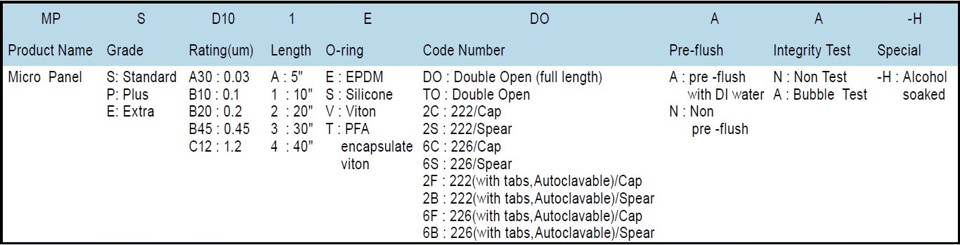 Micro Panel cartridges are constructed by Polyethersulfone membrane and polypropylene (support, core and end cap). Micro Panel's unique mirrored-anisotropic PES membrane has exceptionally high flow rates and long on-steam life, and provides consistent removal of both organic and inorganic particulates.